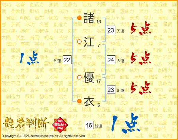 生活面を象徴する運勢です。外部から受ける影響力を表し、結婚運、家庭運や職場、環境への順応性を表します。総運から人運を引いた画数。姓や名が1文字の場合を除く。