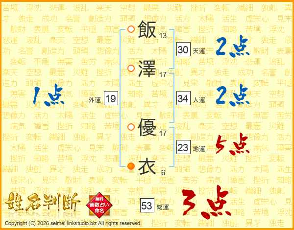 飯(13画)澤(17画) 優(17画)衣(6画)