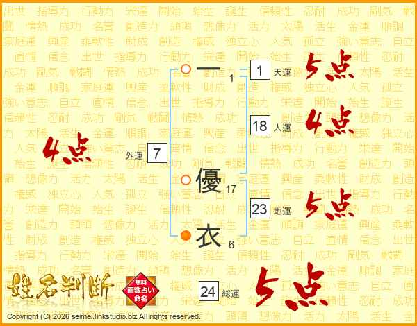 生活面を象徴する運勢です。外部から受ける影響力を表し、結婚運、家庭運や職場、環境への順応性を表します。総運から人運を引いた画数。姓や名が1文字の場合を除く。