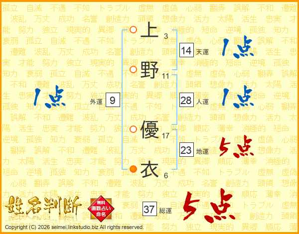 上(3画)野(11画) 優(17画)衣(6画)