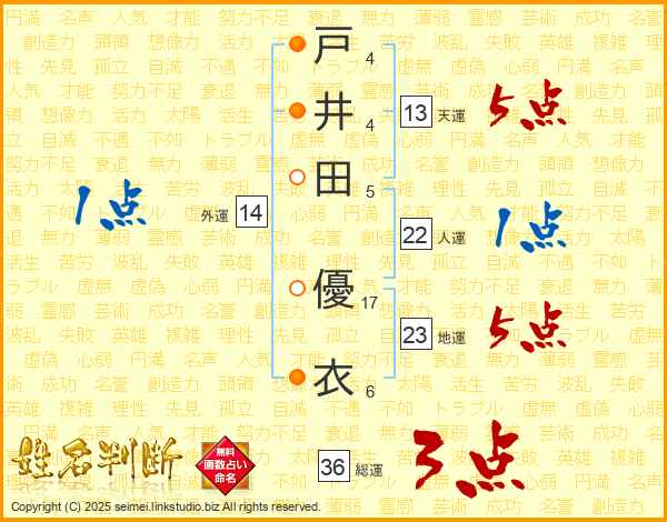 戸(4画)井(4画)田(5画) 優(17画)衣(6画)