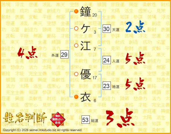 鐘(20画)ケ(3画)江(7画) 優(17画)衣(6画)
