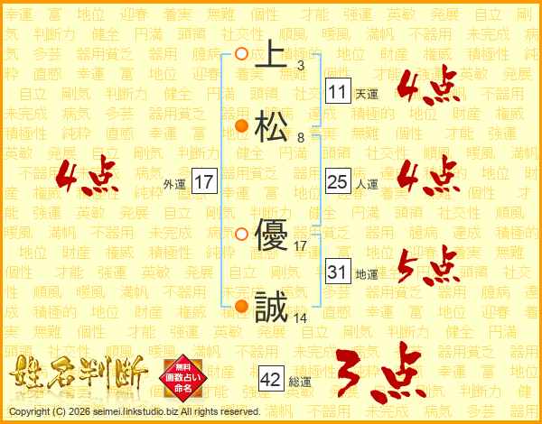 生活面を象徴する運勢です。外部から受ける影響力を表し、結婚運、家庭運や職場、環境への順応性を表します。総運から人運を引いた画数。姓や名が1文字の場合を除く。