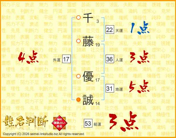 生活面を象徴する運勢です。外部から受ける影響力を表し、結婚運、家庭運や職場、環境への順応性を表します。総運から人運を引いた画数。姓や名が1文字の場合を除く。