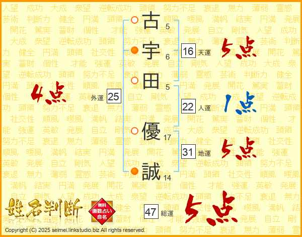 古(5画)宇(6画)田(5画) 優(17画)誠(14画)