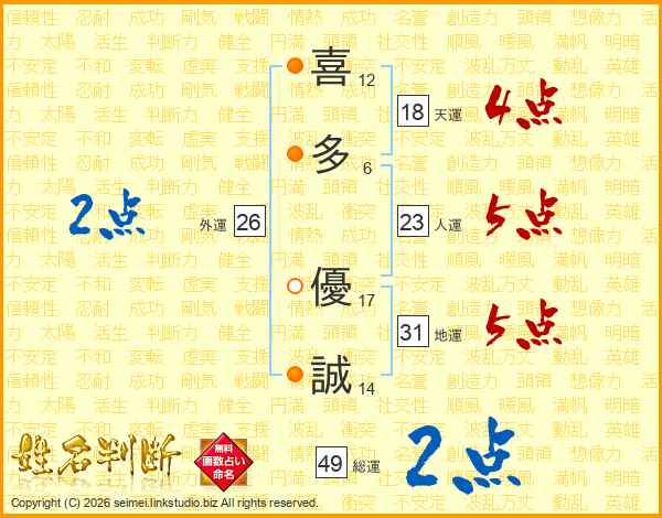 画数の奇数(○陽)と偶数(●陰)の配列で吉凶を占います。どちらかにかたよる名前は大凶名で避ける必要があります。画数の奇数偶数。