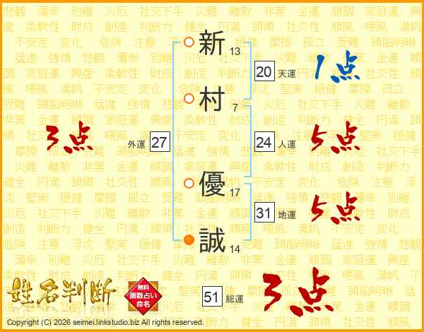 新(13画)村(7画) 優(17画)誠(14画)