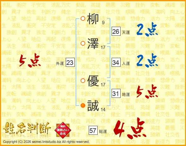 柳(9画)澤(17画) 優(17画)誠(14画)