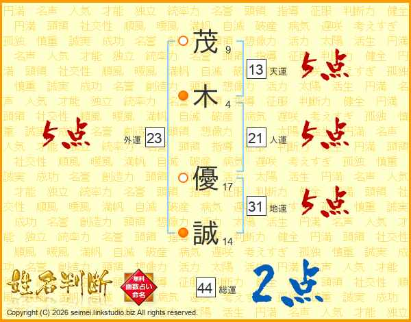 茂(9画)木(4画) 優(17画)誠(14画)