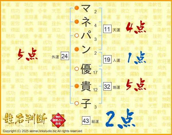 マ(2画)ネ(4画)パ(3画)ン(2画) 優(17画)貴(12画)子(3画)