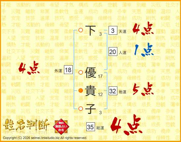 生活面を象徴する運勢です。外部から受ける影響力を表し、結婚運、家庭運や職場、環境への順応性を表します。総運から人運を引いた画数。姓や名が1文字の場合を除く。