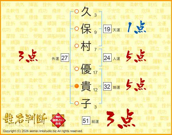 久(3画)保(9画)村(7画) 優(17画)貴(12画)子(3画)