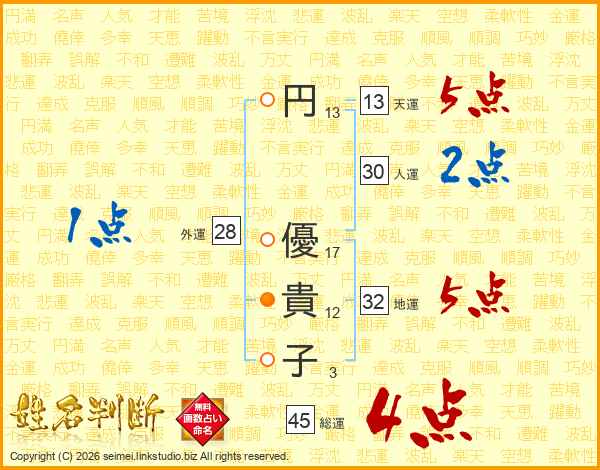 円(13画) 優(17画)貴(12画)子(3画)