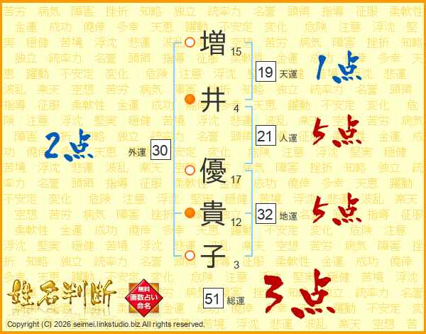 増(15画)井(4画) 優(17画)貴(12画)子(3画)