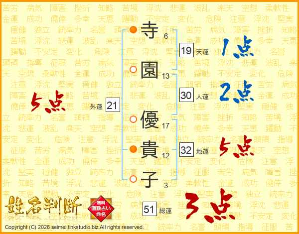 寺(6画)園(13画) 優(17画)貴(12画)子(3画)