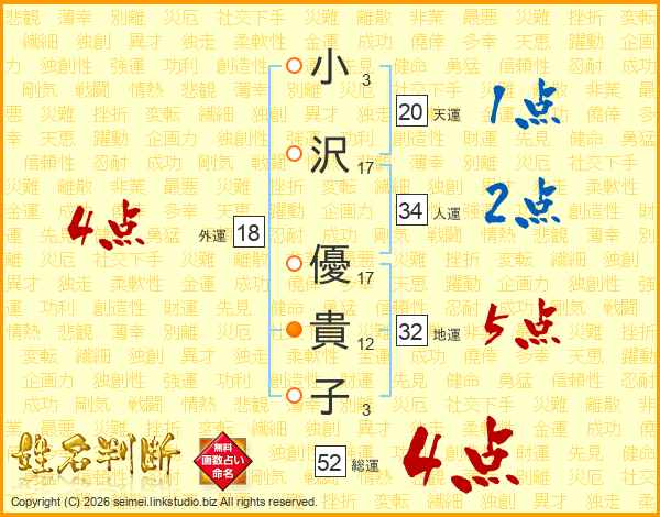 小(3画)沢(17画) 優(17画)貴(12画)子(3画)