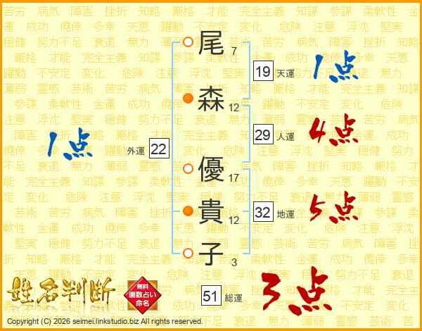 尾(7画)森(12画) 優(17画)貴(12画)子(3画)