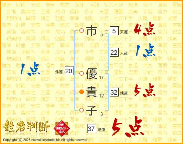 市(5画) 優(17画)貴(12画)子(3画)