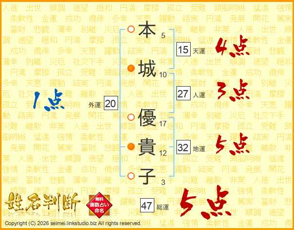 本(5画)城(10画) 優(17画)貴(12画)子(3画)