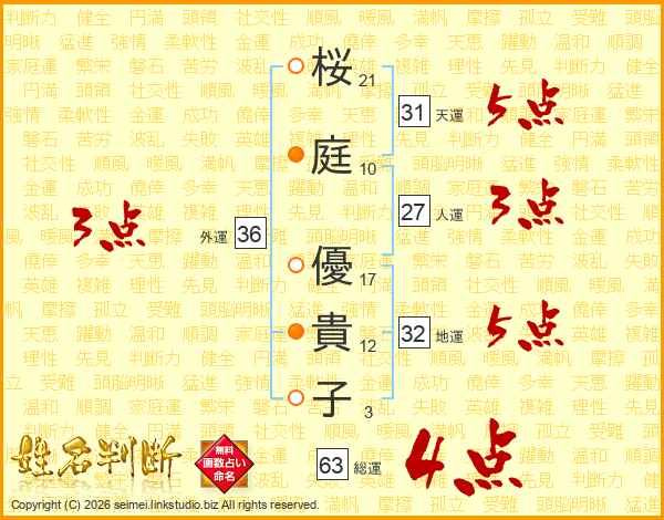 桜(21画)庭(10画) 優(17画)貴(12画)子(3画)