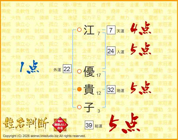 生活面を象徴する運勢です。外部から受ける影響力を表し、結婚運、家庭運や職場、環境への順応性を表します。総運から人運を引いた画数。姓や名が1文字の場合を除く。