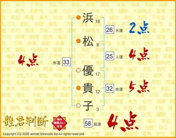 浜(18画)松(8画) 優(17画)貴(12画)子(3画)