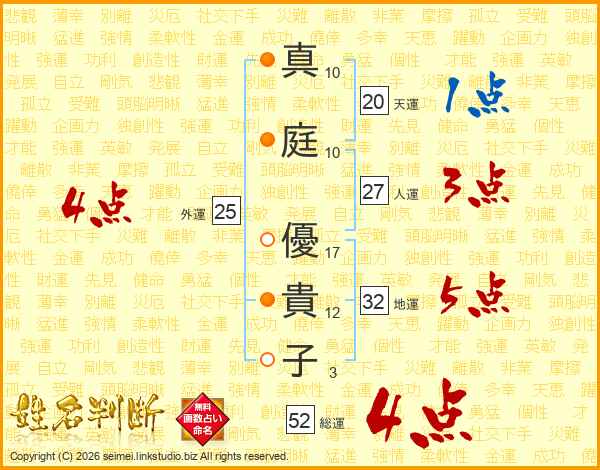 真(10画)庭(10画) 優(17画)貴(12画)子(3画)