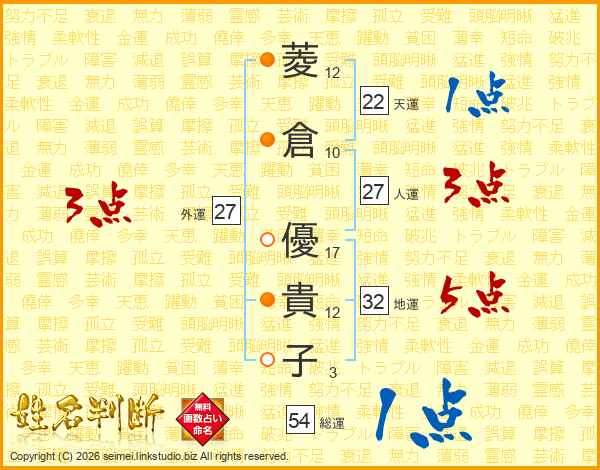 菱(12画)倉(10画) 優(17画)貴(12画)子(3画)
