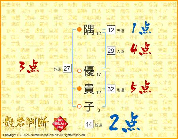 隅(12画) 優(17画)貴(12画)子(3画)