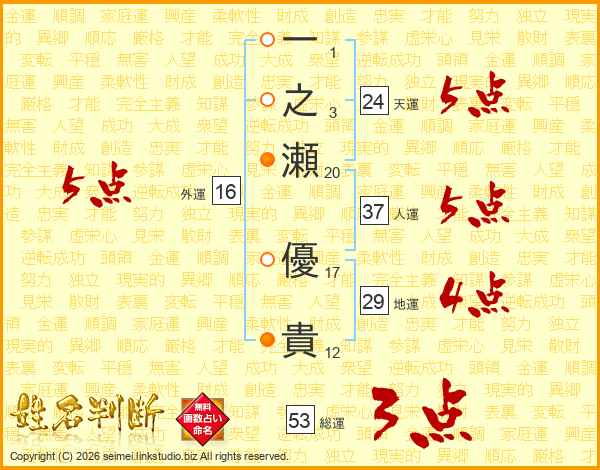 一之瀬優貴さんの総運は53画の3点!
