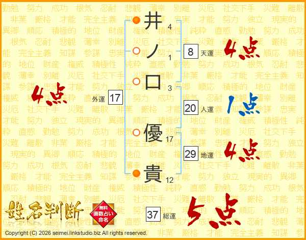 井(4画)ノ(1画)口(3画) 優(17画)貴(12画)