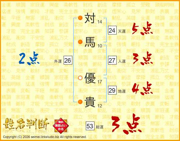 対(14画)馬(10画) 優(17画)貴(12画)