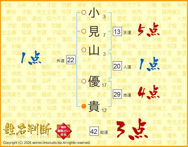 小(3画)見(7画)山(3画) 優(17画)貴(12画)