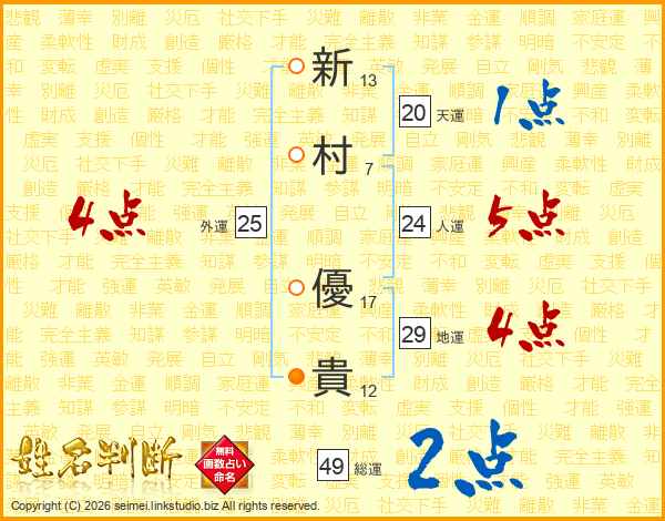 新(13画)村(7画) 優(17画)貴(12画)