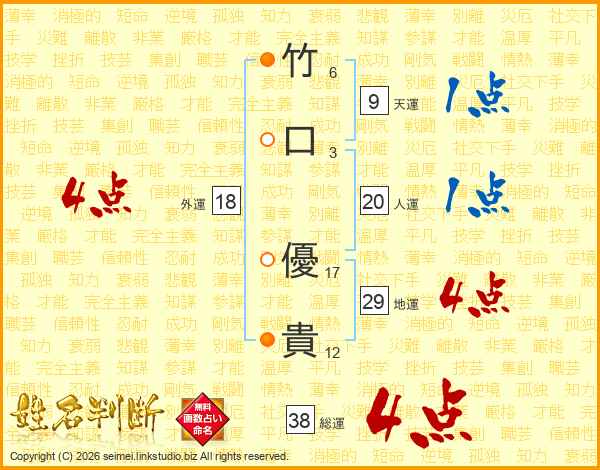 竹(6画)口(3画) 優(17画)貴(12画)