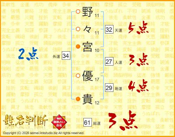 野(11画)々(11画)宮(10画) 優(17画)貴(12画)