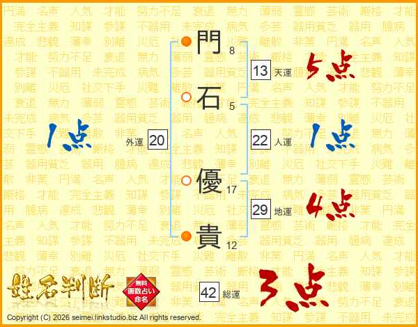生活面を象徴する運勢です。外部から受ける影響力を表し、結婚運、家庭運や職場、環境への順応性を表します。総運から人運を引いた画数。姓や名が1文字の場合を除く。