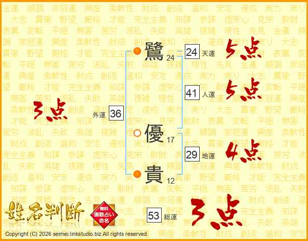 鷺(24画) 優(17画)貴(12画)