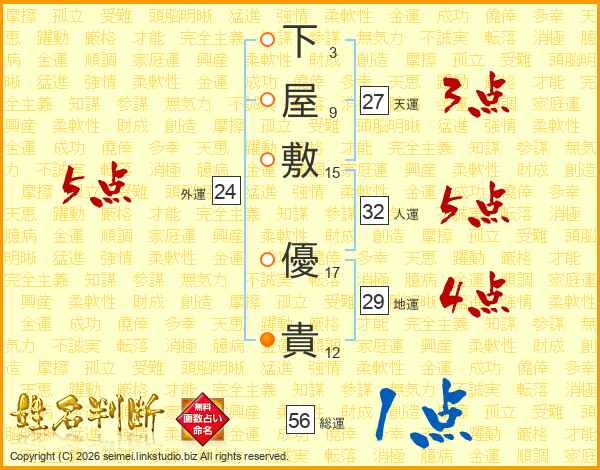 下(3画)屋(9画)敷(15画) 優(17画)貴(12画)