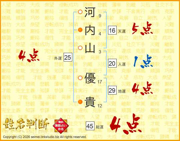 河(9画)内(4画)山(3画) 優(17画)貴(12画)
