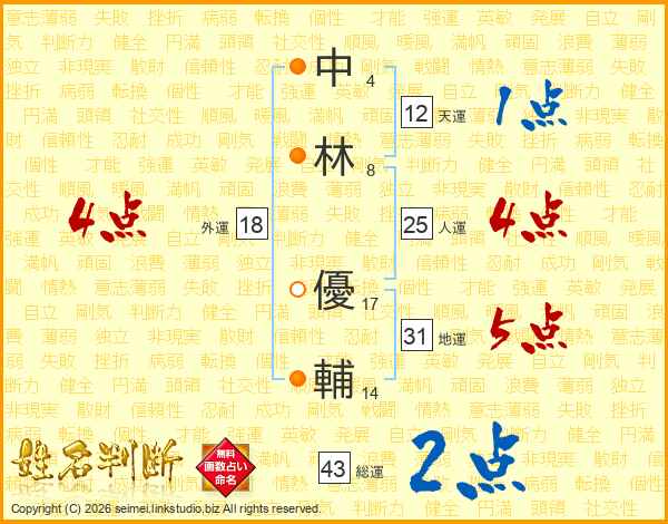 あなたの人生を表す1番重要な運勢です。生涯を通じて影響する総合運となり、主に50歳以降の晩年期に影響を及ぼします。苗字と名前の合計画数。