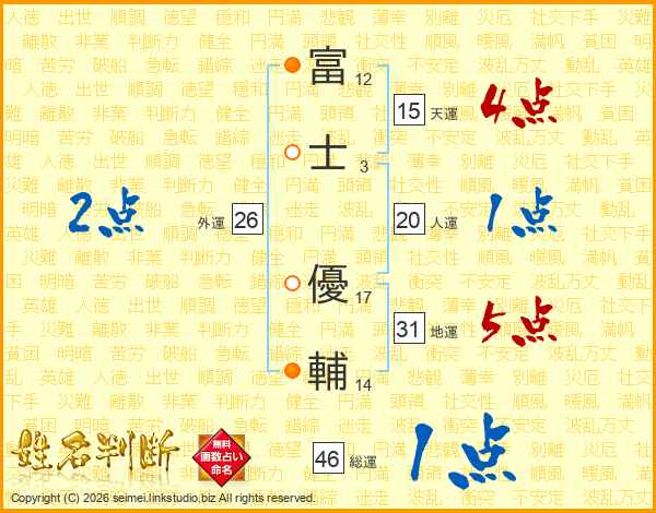生活面を象徴する運勢です。外部から受ける影響力を表し、結婚運、家庭運や職場、環境への順応性を表します。総運から人運を引いた画数。姓や名が1文字の場合を除く。