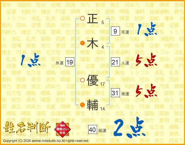 あなたの人生を表す1番重要な運勢です。生涯を通じて影響する総合運となり、主に50歳以降の晩年期に影響を及ぼします。苗字と名前の合計画数。
