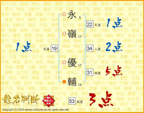永(5画)嶺(17画) 優(17画)輔(14画)