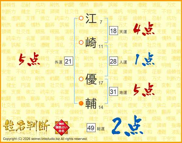 生活面を象徴する運勢です。外部から受ける影響力を表し、結婚運、家庭運や職場、環境への順応性を表します。総運から人運を引いた画数。姓や名が1文字の場合を除く。