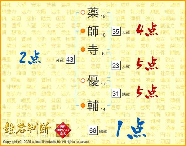 薬(19画)師(10画)寺(6画) 優(17画)輔(14画)