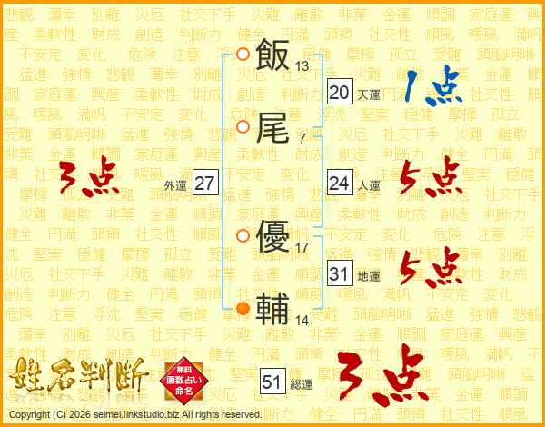 飯(13画)尾(7画) 優(17画)輔(14画)