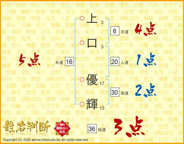 上(3画)口(3画) 優(17画)輝(13画)