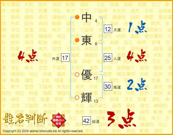 中(4画)東(8画) 優(17画)輝(13画)