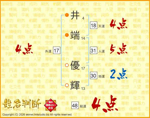 井(4画)端(14画) 優(17画)輝(13画)